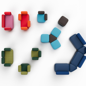 Suiseki modular couch by LaCividina: a collection of padded seats inspired – as its name suggests – by the Japanese art of arranging naturally occurring stones. Spontaneous, harmonious lack of alignment takes the place of geometric shapes in the simple modular units with organic volumes. Everything starts with three core building blocks: a low, broad seat, a backrest and an armrest. They can be combined with each other in an offset display of heights, widths and depths. The resulting sofas are sculpturesque and suitable for all types of use, in everything from the contract market to private homes.